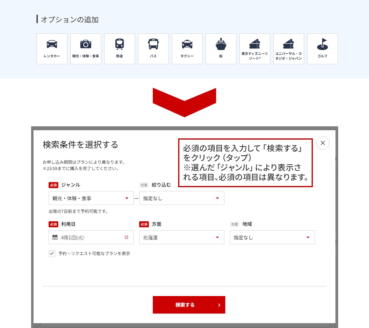 往復のフライト+宿泊を選択後、「選択内容の確認(カート)」画面の下部にある「オプションの追加」よりお申し込みください。