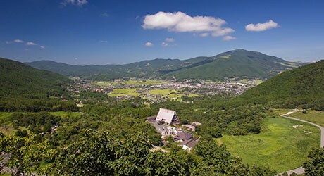 観光タクシーでグローバルタワー、火男火売神社(ほのおほのめじんじゃ)、狭霧台展望所に立ち寄り由布院へ向かいます(1台4名まで乗車可)。狭霧台から見下ろす由布院盆地は絶景です。午前は別府~由布院間の絶景ドライブを午後は由布院の自由散策をお楽しみください。