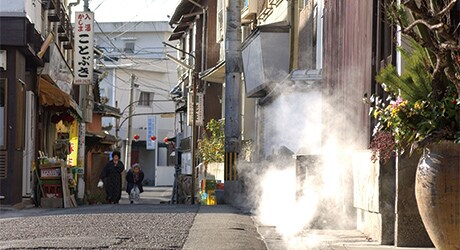 源泉の温度が高く、あちこちから立ちのぼる湯けむりが別府の景観を特徴づけています。