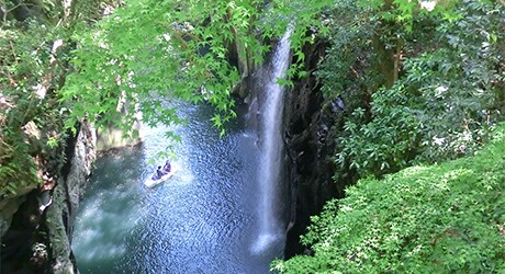 神話の舞台となった天岩戸神社や天安河原を訪ねた後は高千穂峡へ。阿蘇山の火山活動で噴出した火砕流が侵食され、柱状節理の素晴らしい断崖となった高千穂峡は1934年(昭和9年)に国の名勝・天然記念物に指定されました。真名井の滝は日本の滝百選に選ばれています。