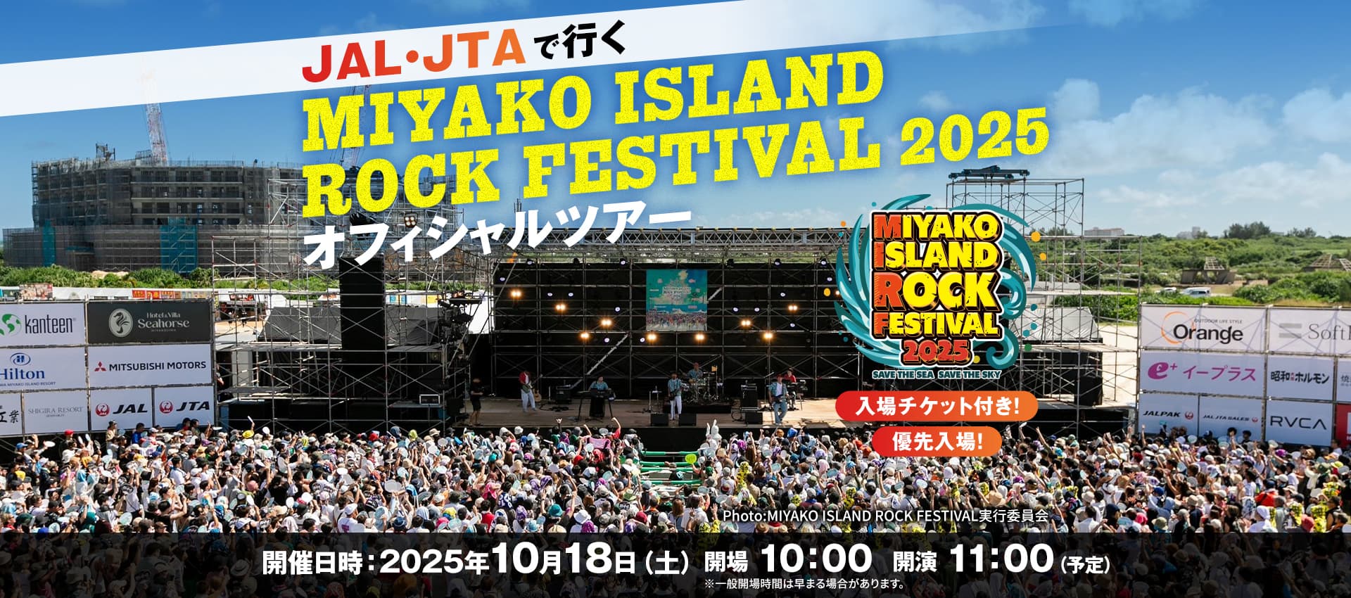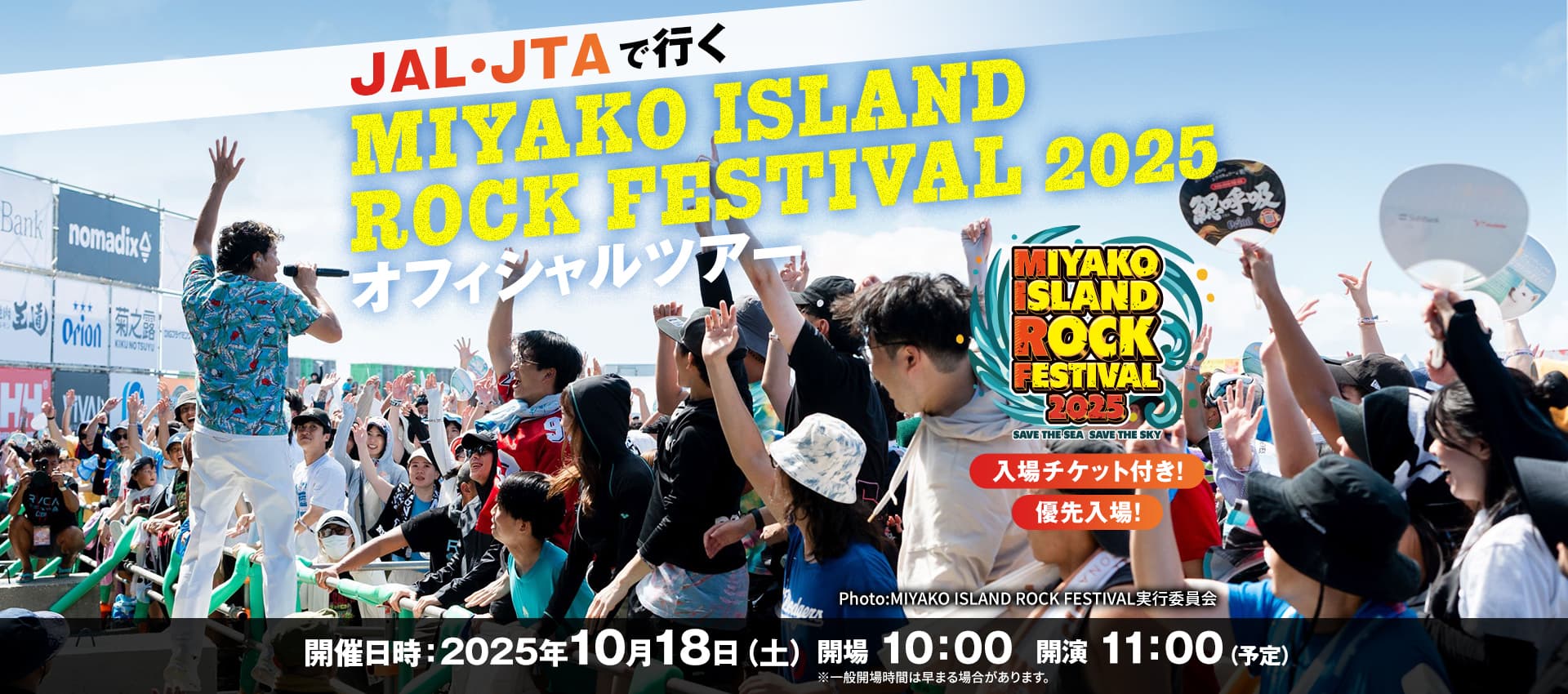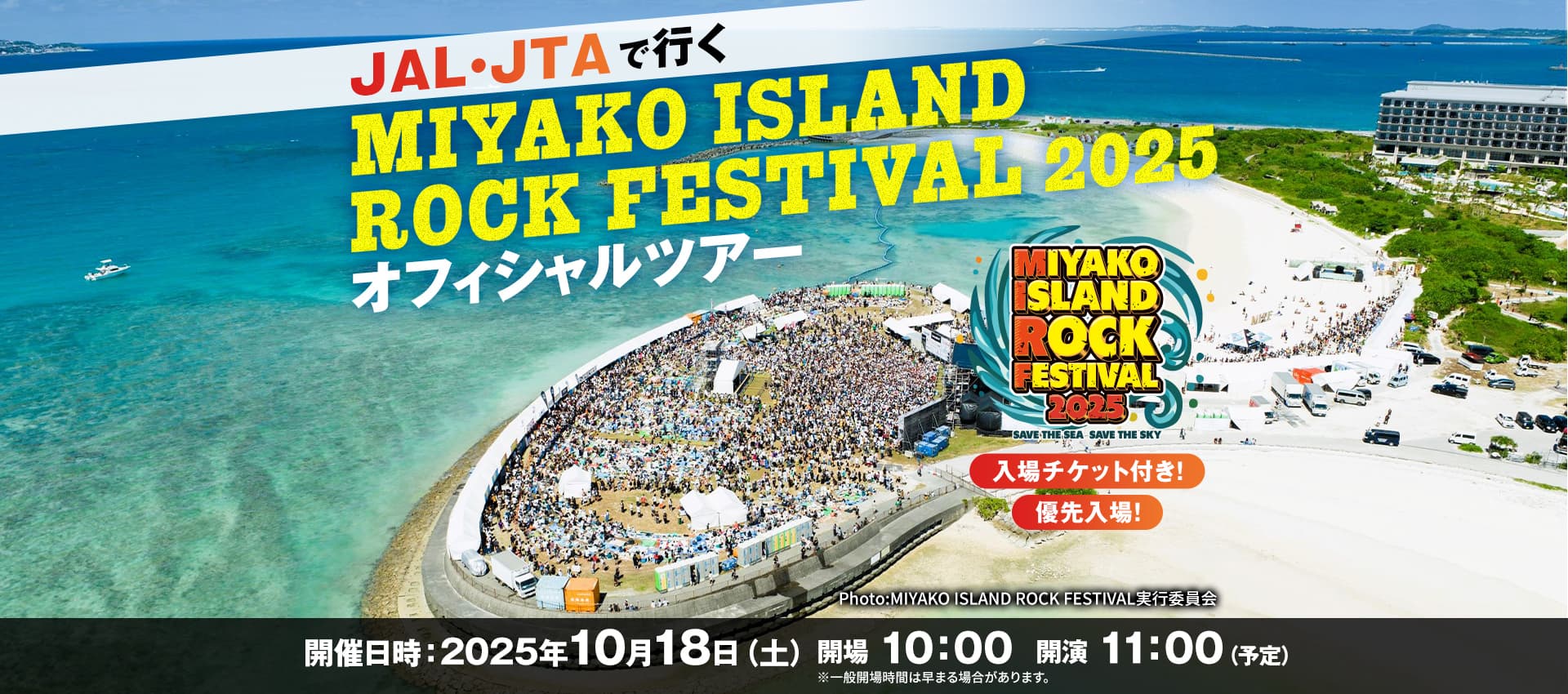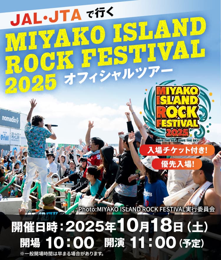 MIYAKO ISLAND ROCK FESTIVAL、通称宮ロックは大自然を満喫できるロケーションでありながら宿泊施設や繁華街からも車ですぐ到着できる場所で、フェスの前後で観光や旅を楽しめる、まさに「フェス旅」に最適なフェスです!!ジャルパック公式ツアーでは航空券・宿泊・フェスの入場チケットがセットで購入できるという便利さに加え、ツアー参加者は開場前の優先入場が可能。ステージ後方のシートエリアの確保やフェスグッズを先に購入したい方におすすめです!宮ロックでフェス旅を楽しんでみてください!