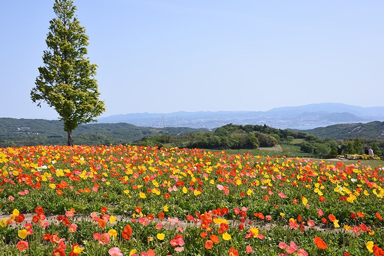 高原に四季折々の花畑が広がり、花の名所としてふさわしい「あわじ花さじき」。季節によって変わる花のじゅうたんの世界をどうぞ。