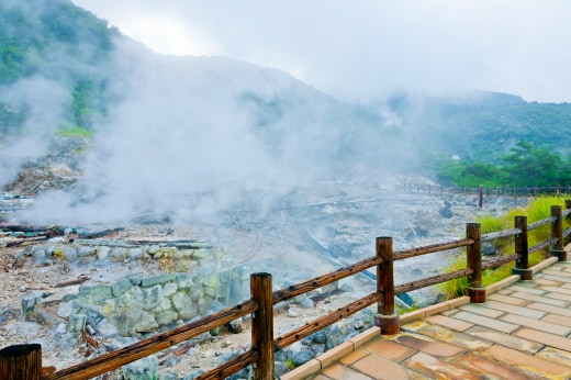 強い硫黄臭とモクモクとした湯けむりに包まれる雲仙地獄。あちこちから高温の温泉と噴気が激しく噴きだし、周辺にはまるで地獄のような景色が広がります。
