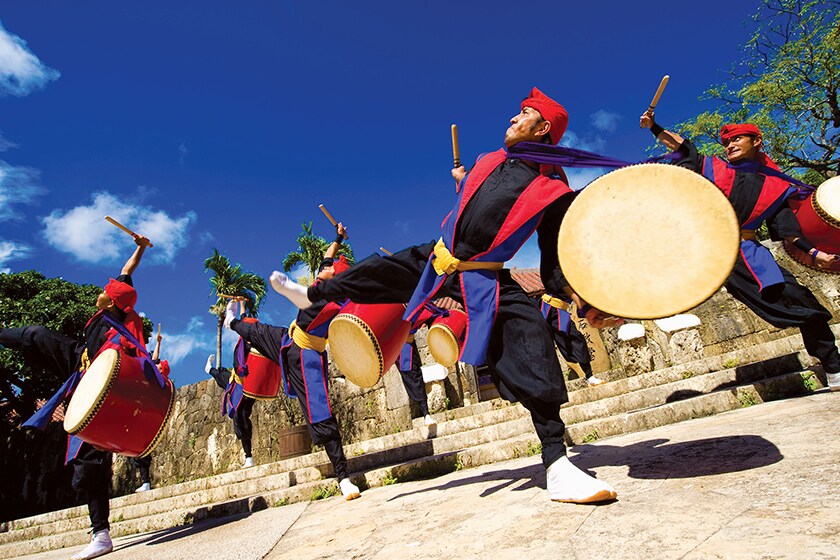 沖縄の伝統芸能は「宮廷芸能」と「民俗芸能」と大きく分けて2つあり、現在も劇場やテーマパークなどでご覧いただくことができます。「宮廷芸能」と呼ばれる「組踊」や「琉球舞踊」は宮廷料理と同様に、冊封使をもてなすため、主に首里城で披露されていました。「民俗芸能」は「獅子舞」や「エイサー」など、各地域の行事や祭りで行われており、沖縄らしい風景として現在も受け継がれています。