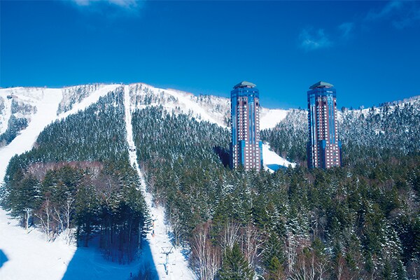 外観のデザインが特徴的なトマムのランドマークホテル。ファミリーゲレンデが目の前なので、アクティブに滞在したいご家族におすすめです。
