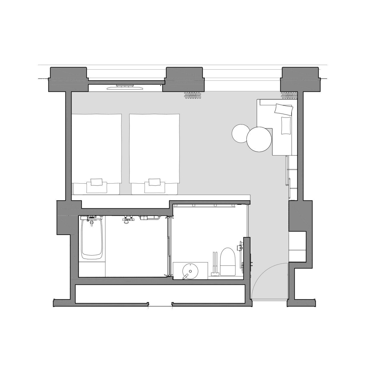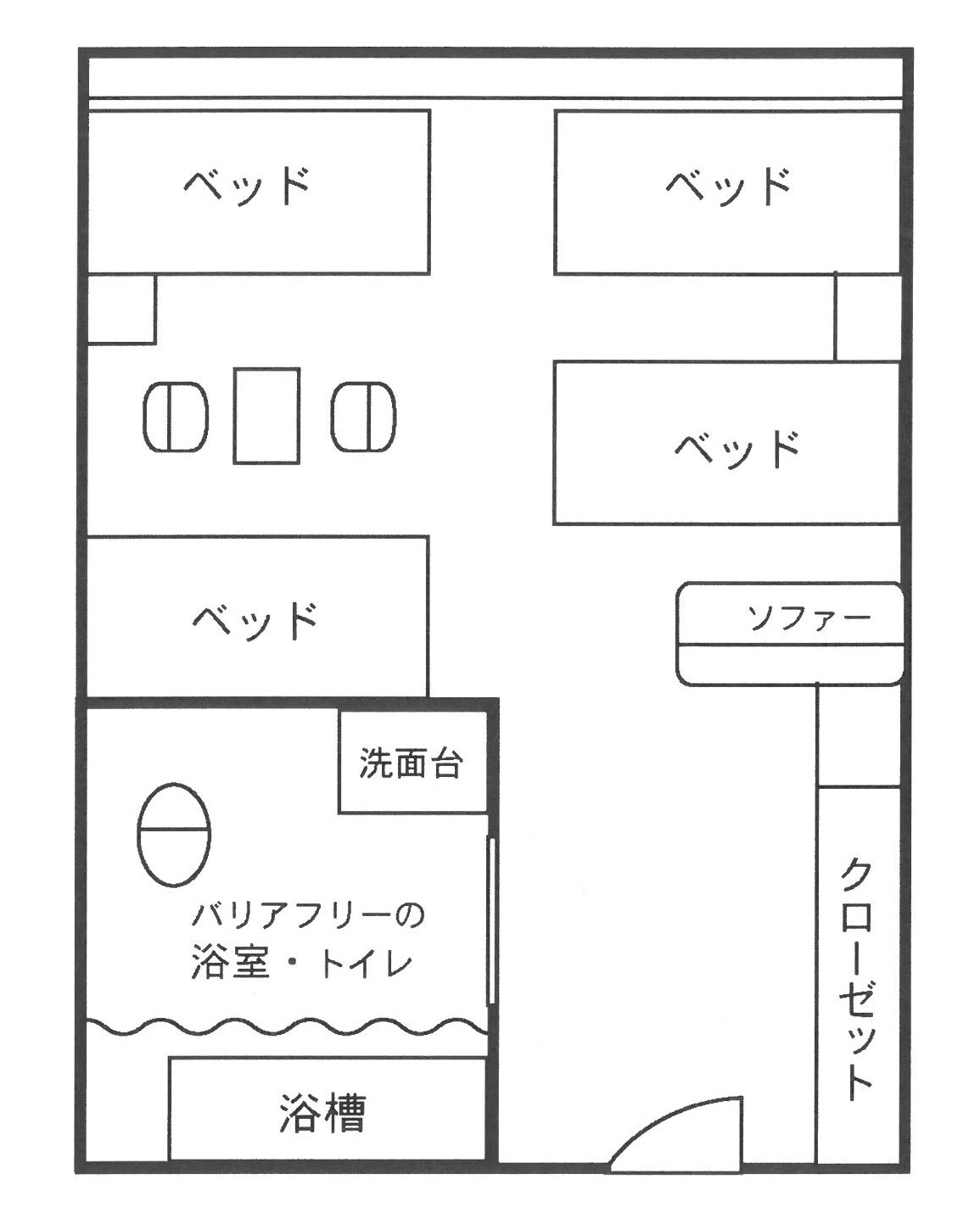 車いすのまま入れる洗面所や高さの低いバスタブを設置した客室です。