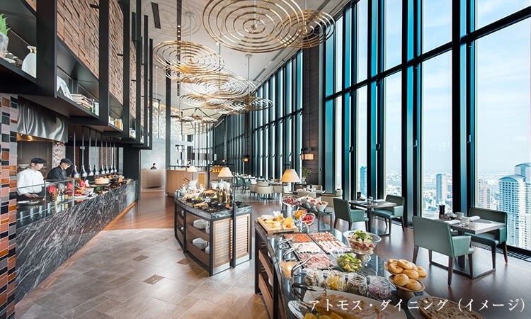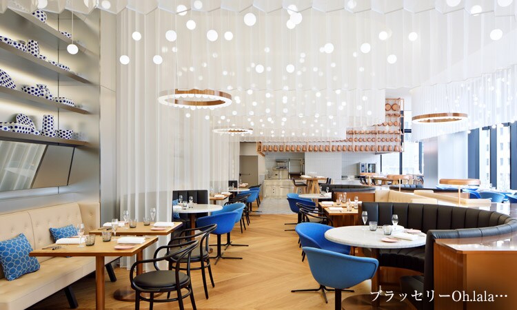 朝食からランチ、ディナーまでご利用いただけるダイニング。窓の先には大阪を代表するメインストリート・御堂筋の美しい並木道が広がり、四季折々の風情をお楽しみいただけます。白、黒、青を基調としたモダンで開放的なインテリアと、アクセントとして使用しているポップな水玉のモチーフが目を引きます。