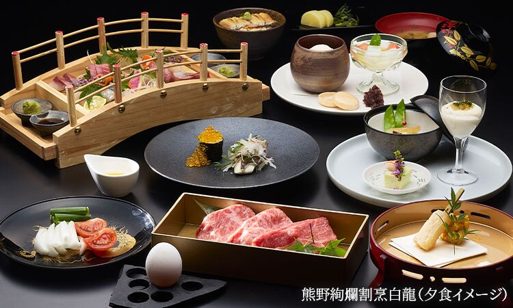 地元産まぐろ(那智勝浦)、熊野牛、伊賀牛、松阪牛、熊野の奉納米「イザナミ米」や「結びの神米」、じゃばらなど地域特産素材を駆使。視覚と味覚を喜ばせる丁寧な料理をお愉しみいただけます。