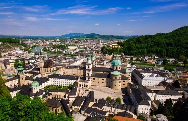 オーストリア中北部、ドイツ国境近くに位置するザルツブルグは、「塩の城」を意味し、塩の採掘で栄えた歴史ある都市です。美しい城塞と湖沼地帯が広がっています。