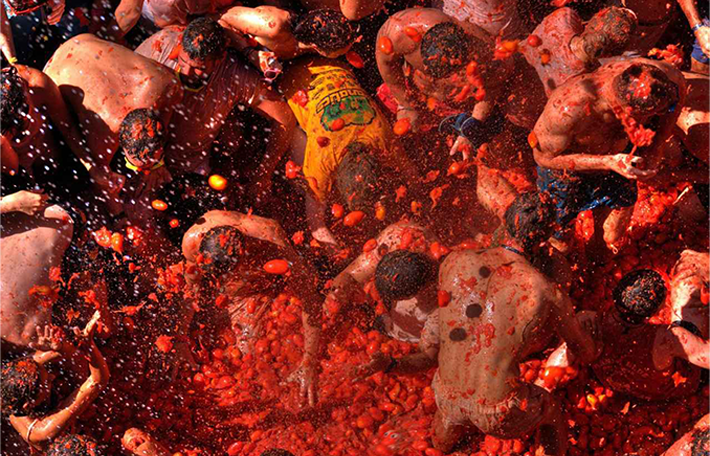 スペインの奇祭「トマト祭り」。ブニョールの町も人も真っ赤に染まる!
