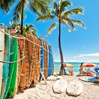 白い砂浜と青く透明な海が美しいワイキキビーチは、波が穏やかなのでサーフィン初心者にぴったりなビーチです。