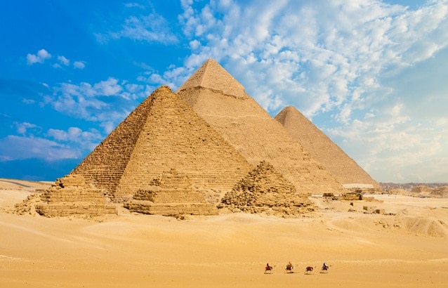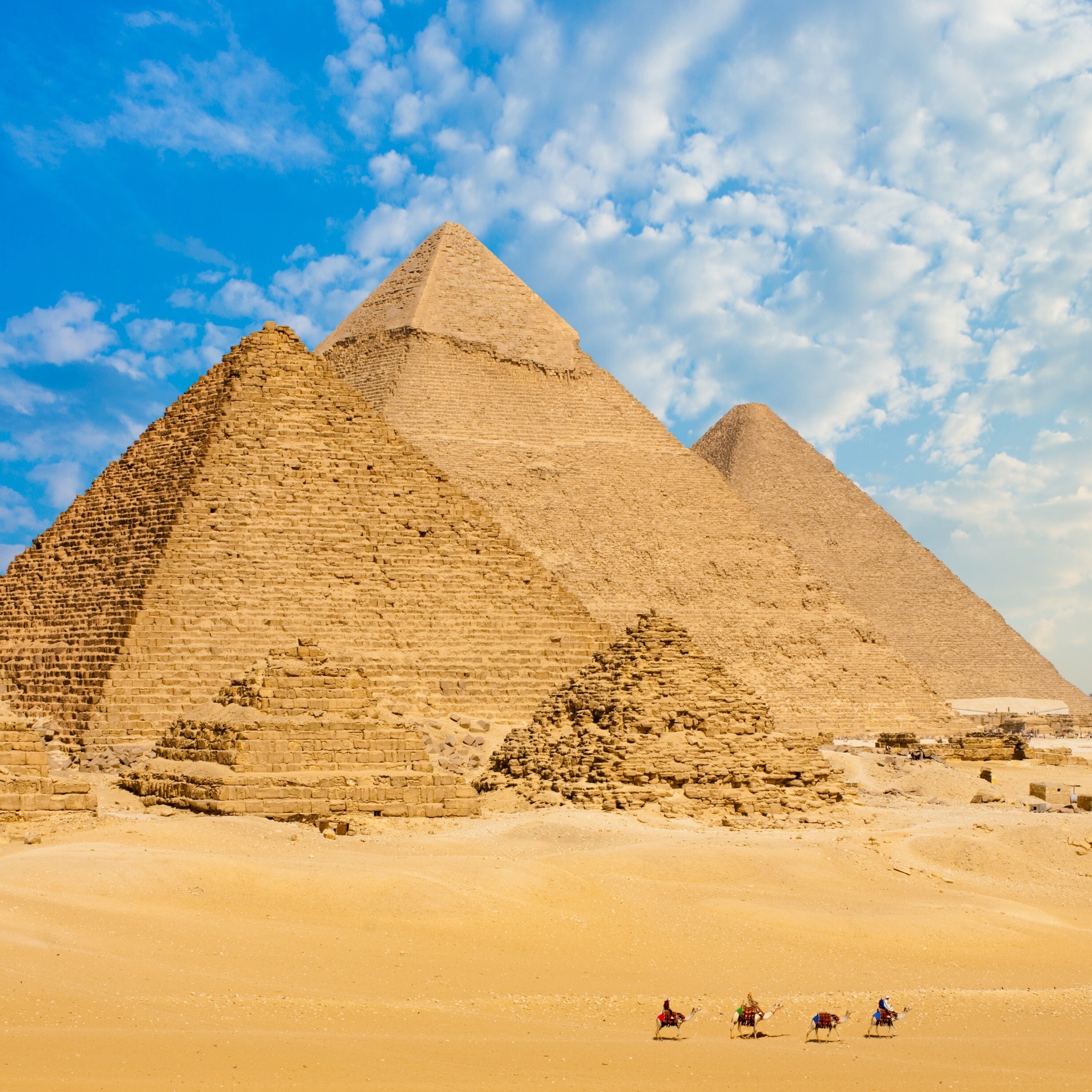ギザ地区の砂漠にそそり立つ有名な3基のピラミッド。ピラミッドは正四角錐の巨大な石造建築で、クフ王、カフラー王、メンカウラー王のピラミッドが並んでいます。