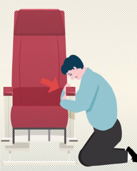 しゃがんで低い姿勢を保ち、近くの座席やひじ掛けにおつかまりください。ひじ掛けをつかむ場合は、下から抱え込むと体が浮き上がることを防止できます。