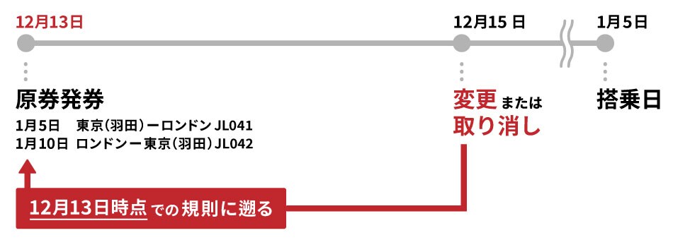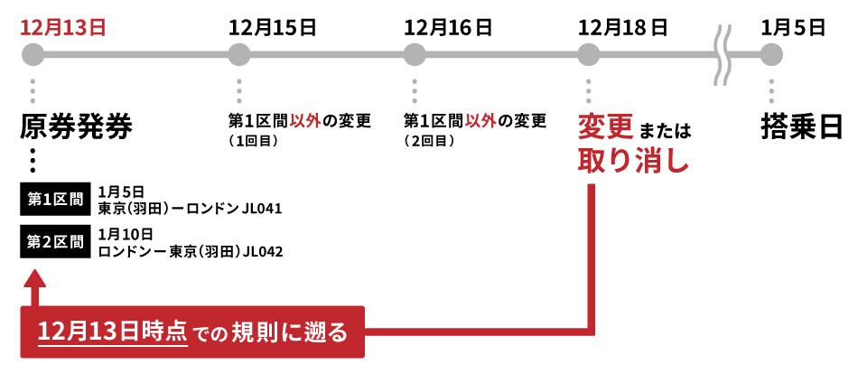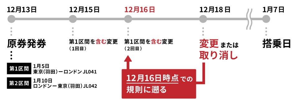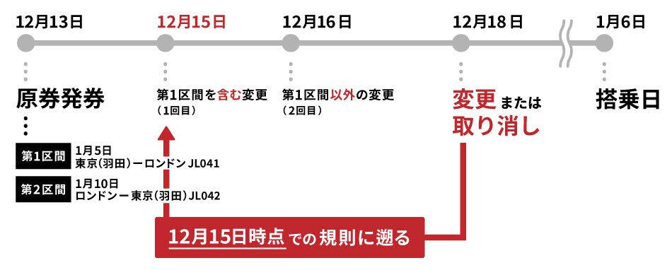 最後に旅程の第1区間を含む予約変更を行った日に有効な変更料金・取消手数料を適用いたします。