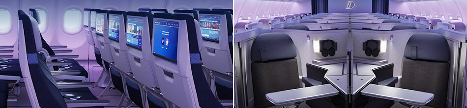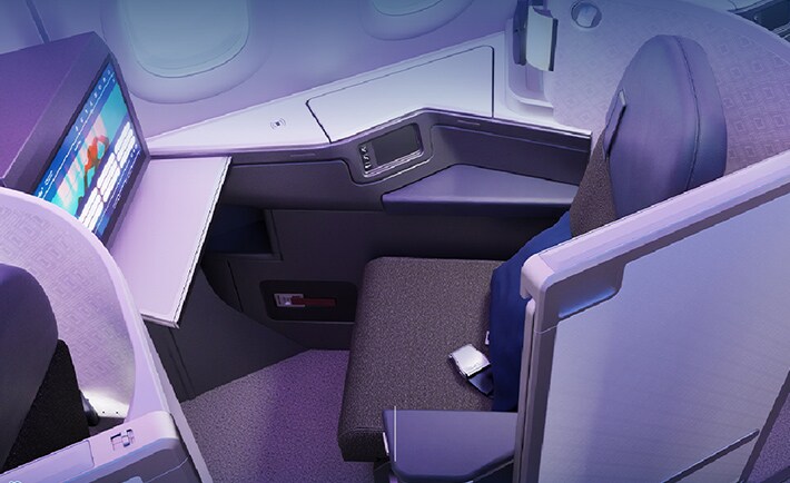 通路に直接アクセスできるフルフラットのビジネスクラスシートを採用。