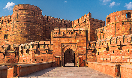 高さ約20m、全長約2.5km。 圧倒的な存在感を放つ赤砂岩の城壁に守られた、世界遺産アグラ城。