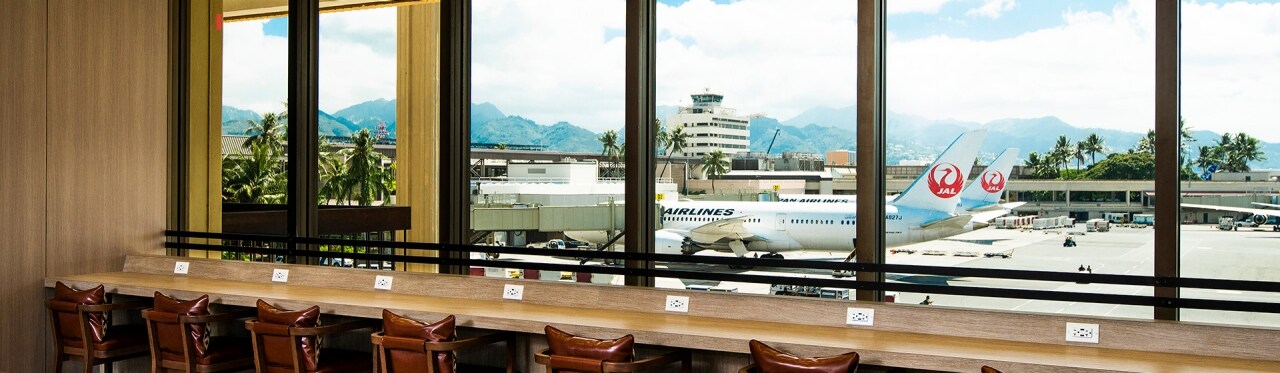 ハワイの景色と出発する飛行機を望むことができるカウンター席では、窓の外を眺めながらゆっくりとお過ごしいただけます。