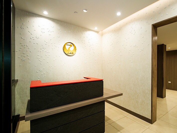 桜舞う上品な空間とハワイらしい素材の溶岩石を用いたレセプションカウンターでお客さまをお迎えします。