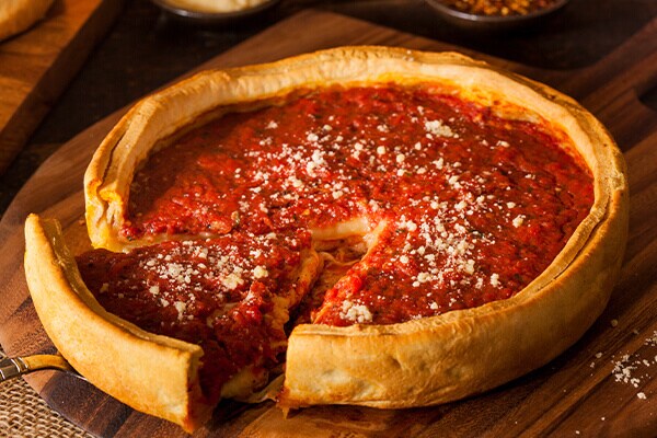 シカゴならではのお食事へ!シカゴを訪れたらぜひ食べていただきたい、シカゴグルメの定番「ディープ・ディッシュ・ピザ(シカゴピザ)」をお楽しみください。