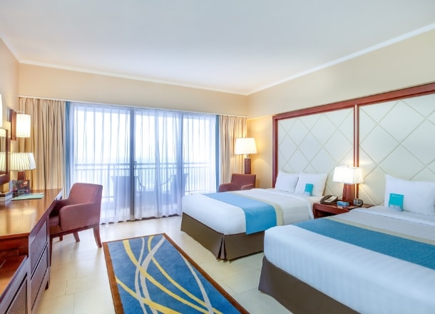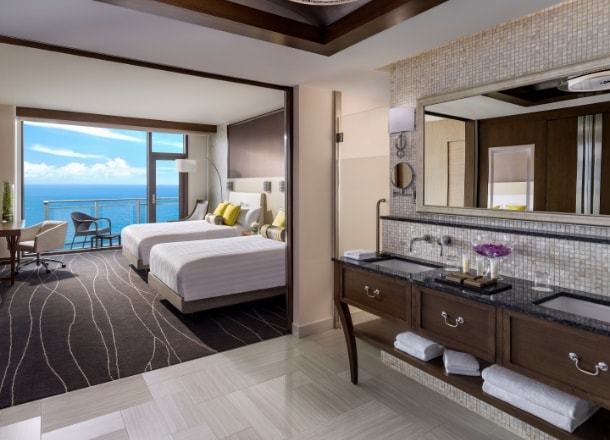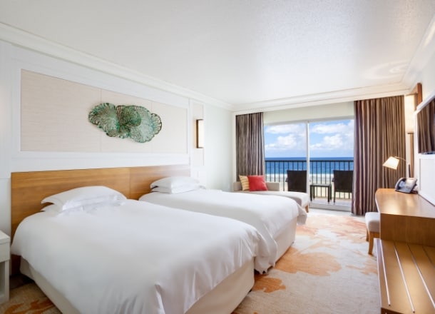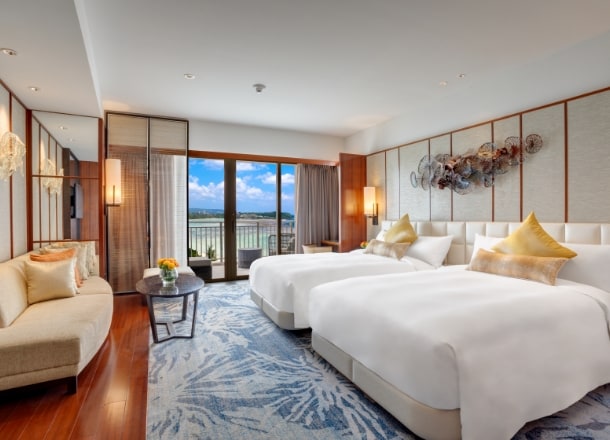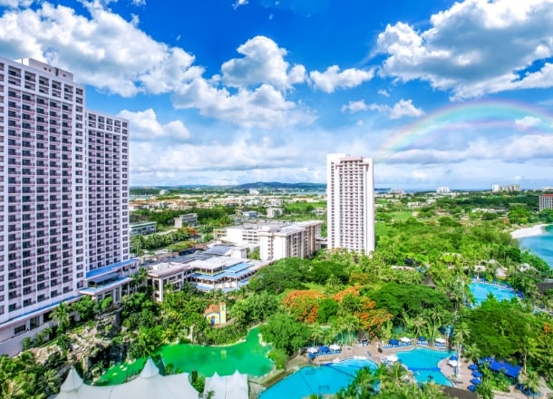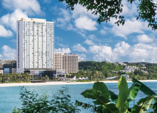 タモン湾の高台に佇むラグジュアリーリゾート。「アウトドアリビング」と言えるほど贅沢なスペースが自慢の広いバルコニーを全室完備。26階のクラブラウンジでは、移り行くタモン湾の絶景を楽しみながら優雅なアフタヌーンティーやカクテルタイムをどうぞ。