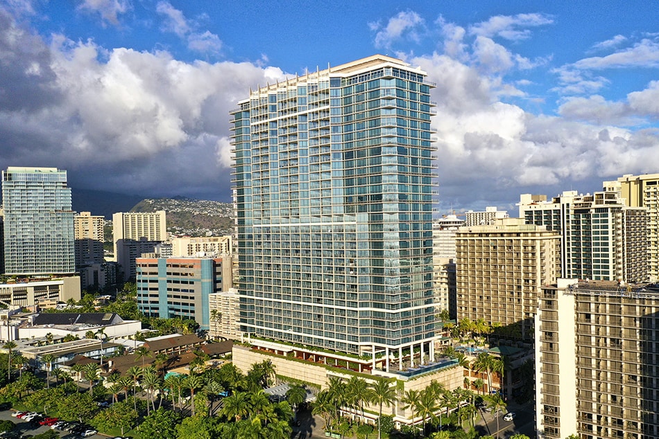高級レジデンススタイルのホテルで、ほとんどのお部屋にキッチンとキチネットを完備!ビーチウォークに隣接しているのでワイキキビーチまで徒歩約2分です。