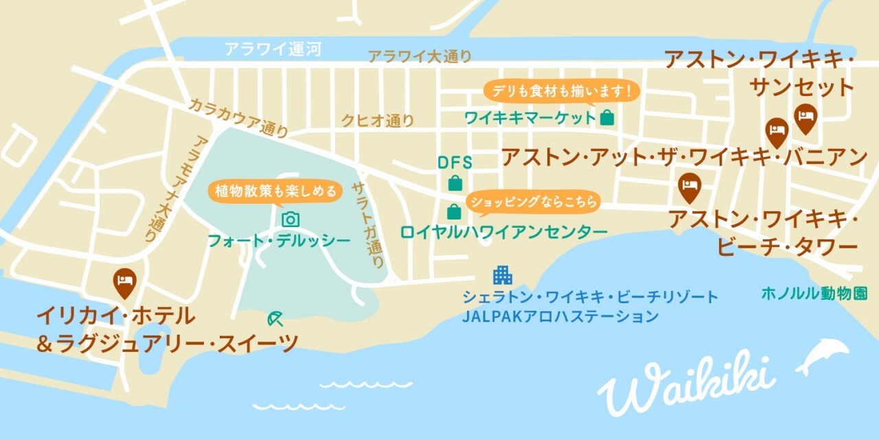 ワイキキビーチ、カピオラニパーク、ホノルル動物園などが徒歩圏内で、家族旅行におすすめです。