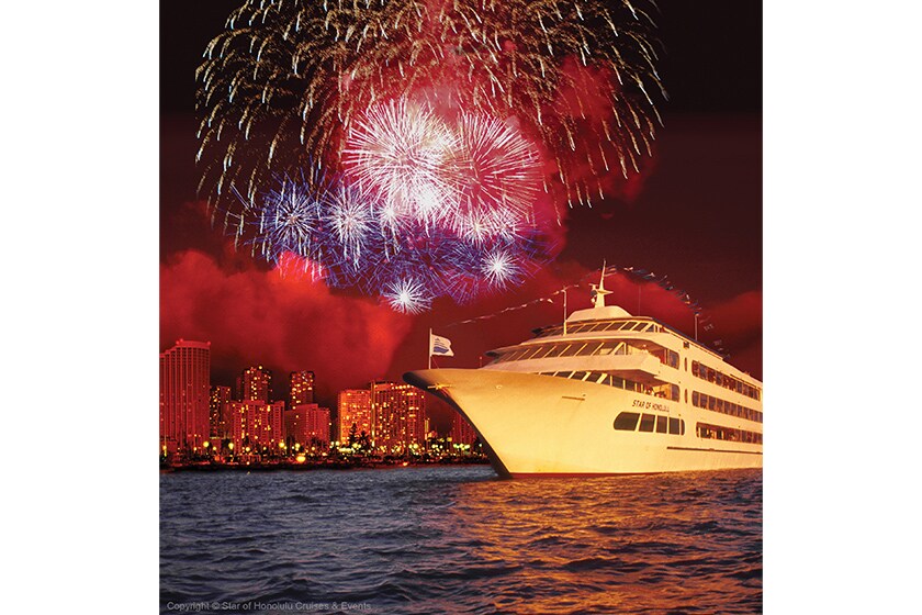 スターオブホノルル号の船上で、にぎやかに新年を迎えましょう!ディナー、ライブエンターテイメント、スパークリングワインでの乾杯などが含まれます。南国感あふれる雰囲気に包まれながら、煌めくホノルルの夜景をお楽しみください。新年を祝う花火もご覧いただけます。