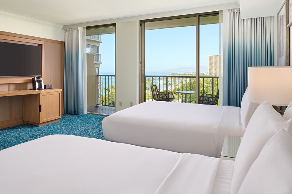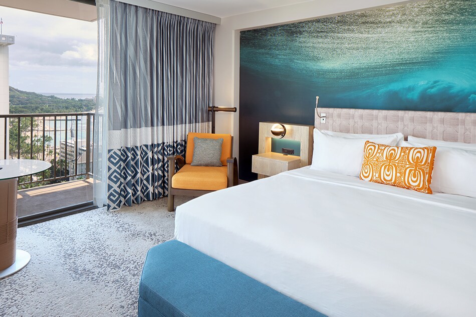 モダンでハワイの心地よい雰囲気が特徴のお部屋。オーシャンタワー(海側)の正面に海が見えるお部屋から、 目の前に広がる海をお楽しみください。