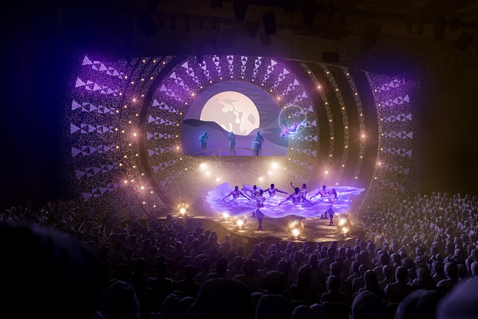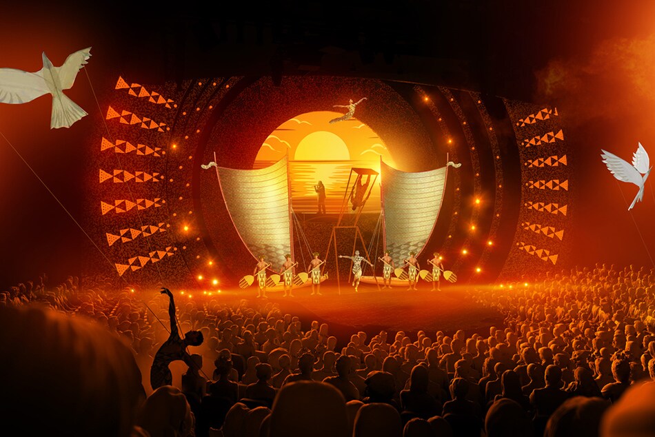 「アウアナ」は卓越したアクロバットに加え、コメディタッチのパフォーマンス、さらにはフラを織り交ぜ、オープニングアクトではポリネシアの島々への移住をテーマにしたハワイならではの壮大なショーが展開されます。