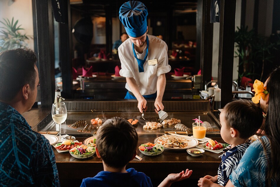 ダイナミックでコミカルな演出パフォーマンスが、ファミリーにも大人気の鉄板焼きレストラン。鉄板焼きの達人シェフが見事な手さばきで調理をする姿を、目の前でお楽しみいただけます。お料理も雰囲気もどちらもお楽しみいただけます。