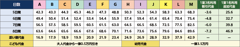 - 1室の最大定員:大人・こども代金のみの場合は3名、添い寝・幼児代金を含めた場合は4名。ただし、1室3名利用の場合の添い寝・幼児代金を含めた最大定員は3名となります。
