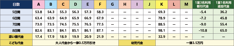 - 1室の最大定員:大人・こども代金のみの場合は3名、添い寝・幼児代金を含めた場合は4名。ただし、1室3名利用の場合の添い寝・幼児代金を含めた最大定員は3名となります。