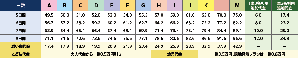 ご希望の出発日の代金区分をご確認の上、各コースの旅行代金をご覧ください。
