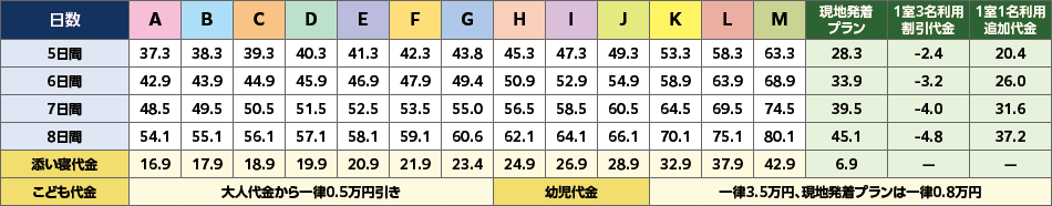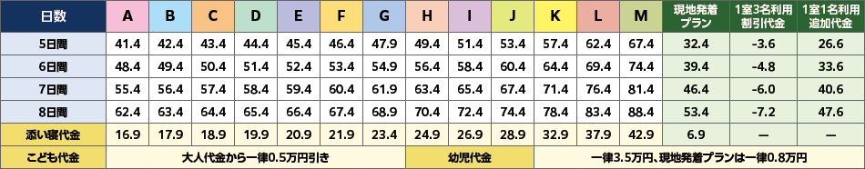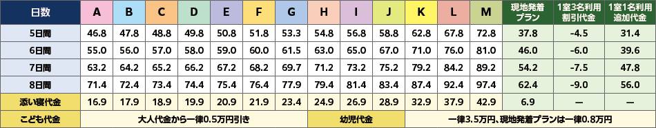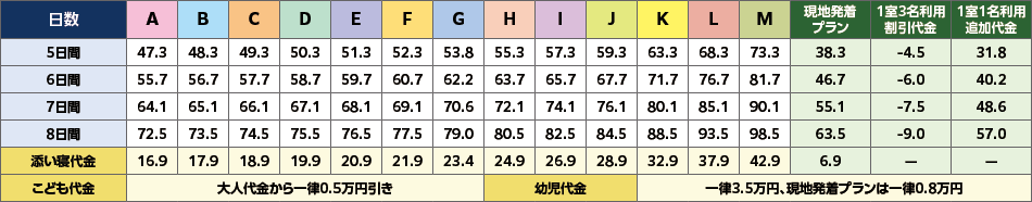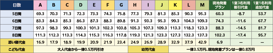 ご希望の出発日の代金区分をご確認の上、各コースの旅行代金をご覧ください。