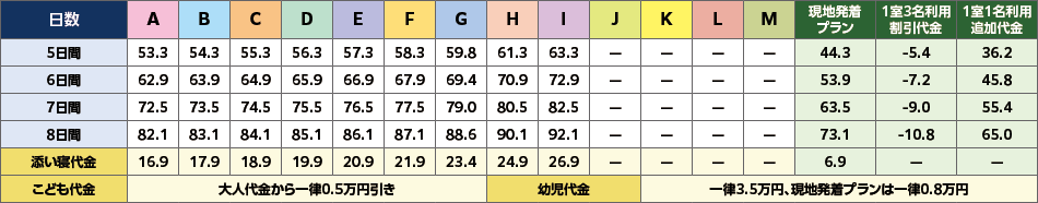 ご希望の出発日の代金区分をご確認の上、各コースの旅行代金をご覧ください。