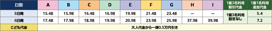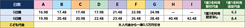 - 1室の最大定員:大人・こども代金のみの場合は3名、添い寝・幼児代金を含めた場合は4名。