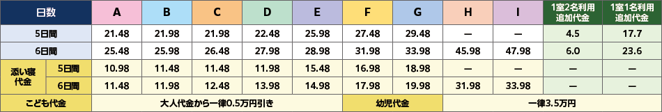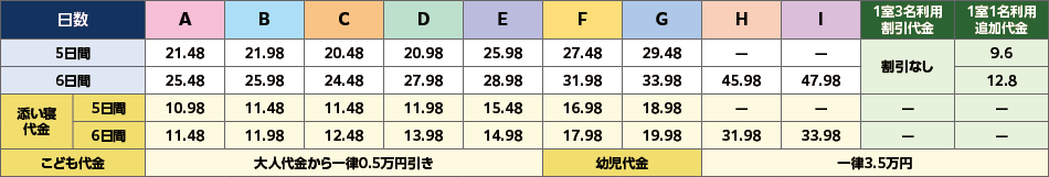 - 1室の最大定員:大人・こども代金のみの場合は3名、添い寝・幼児代金を含めた場合は4名。