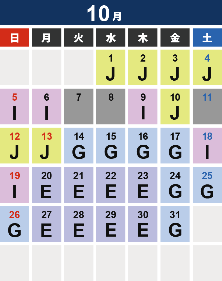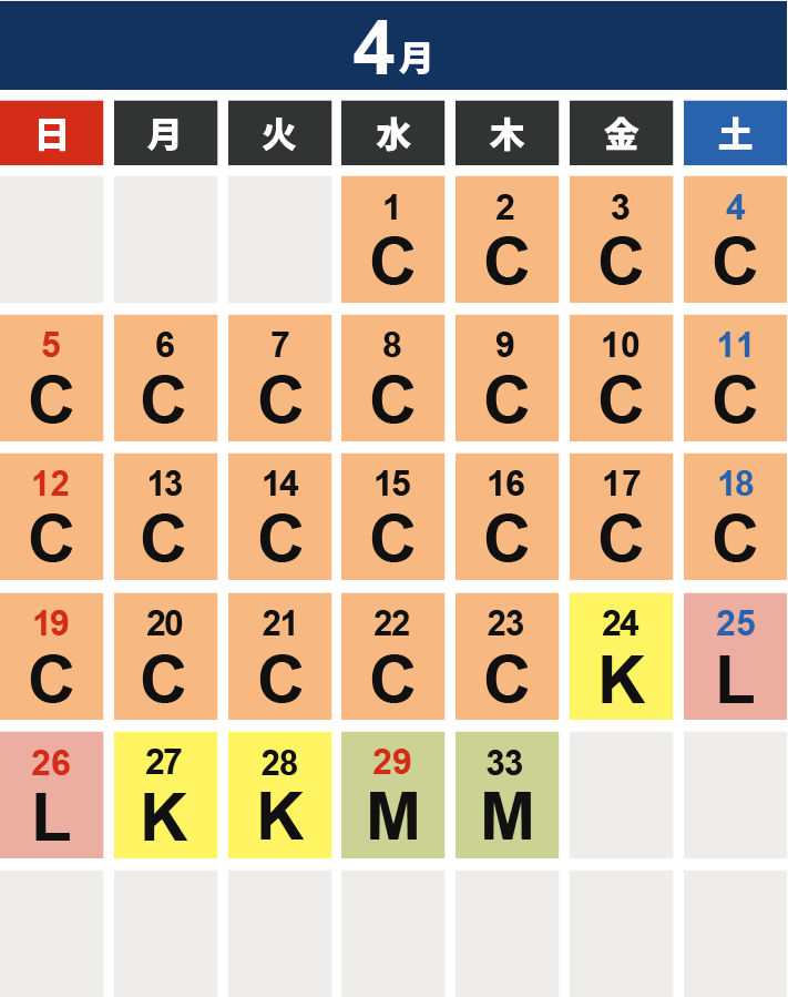 | 10月1日~4月27日出発 | 4月28日~5月6日出発 | 5月7日~5月27日出発 | |