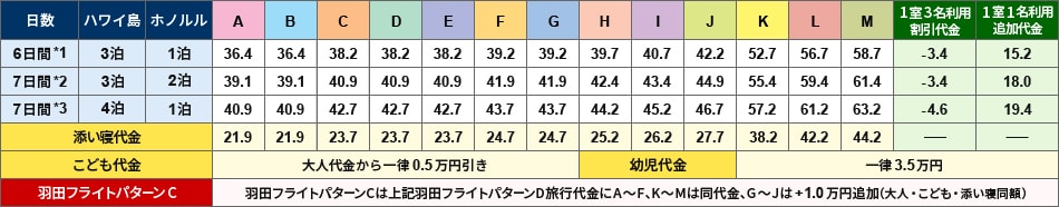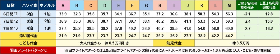 *1ハワイ島3泊+ホノルル1泊 *2ハワイ島3泊+ホノルル2泊 *3ハワイ島4泊+ホノルル1泊