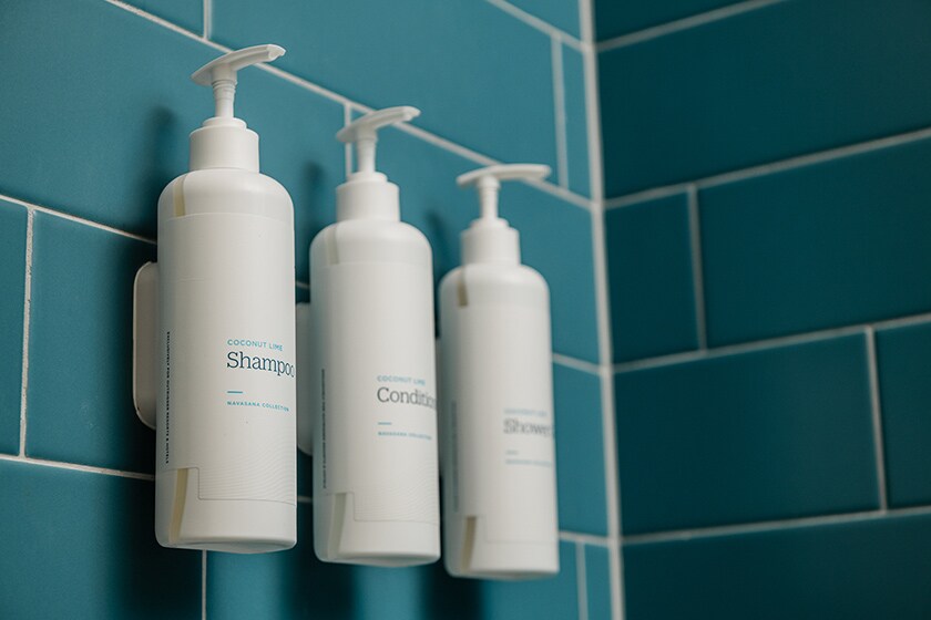 シャンプーなどのお部屋のアメニティも、一人1個のプラスチックボトルから壁掛けの詰め替え式が主流に。ホテルもプラスチックごみの削減に努めています。