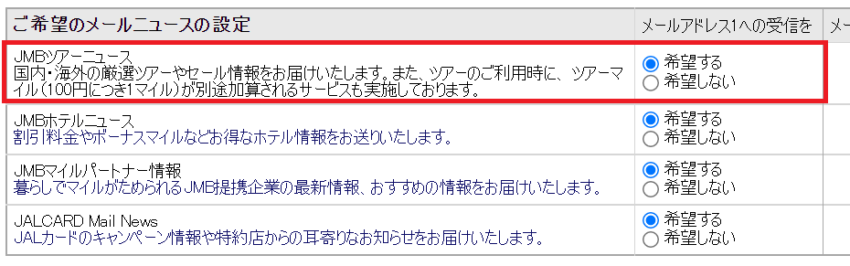 JMBツアーニュースの受信設定で、フライトマイルとショッピングマイルに加えて、ツアーマイルがたまります!