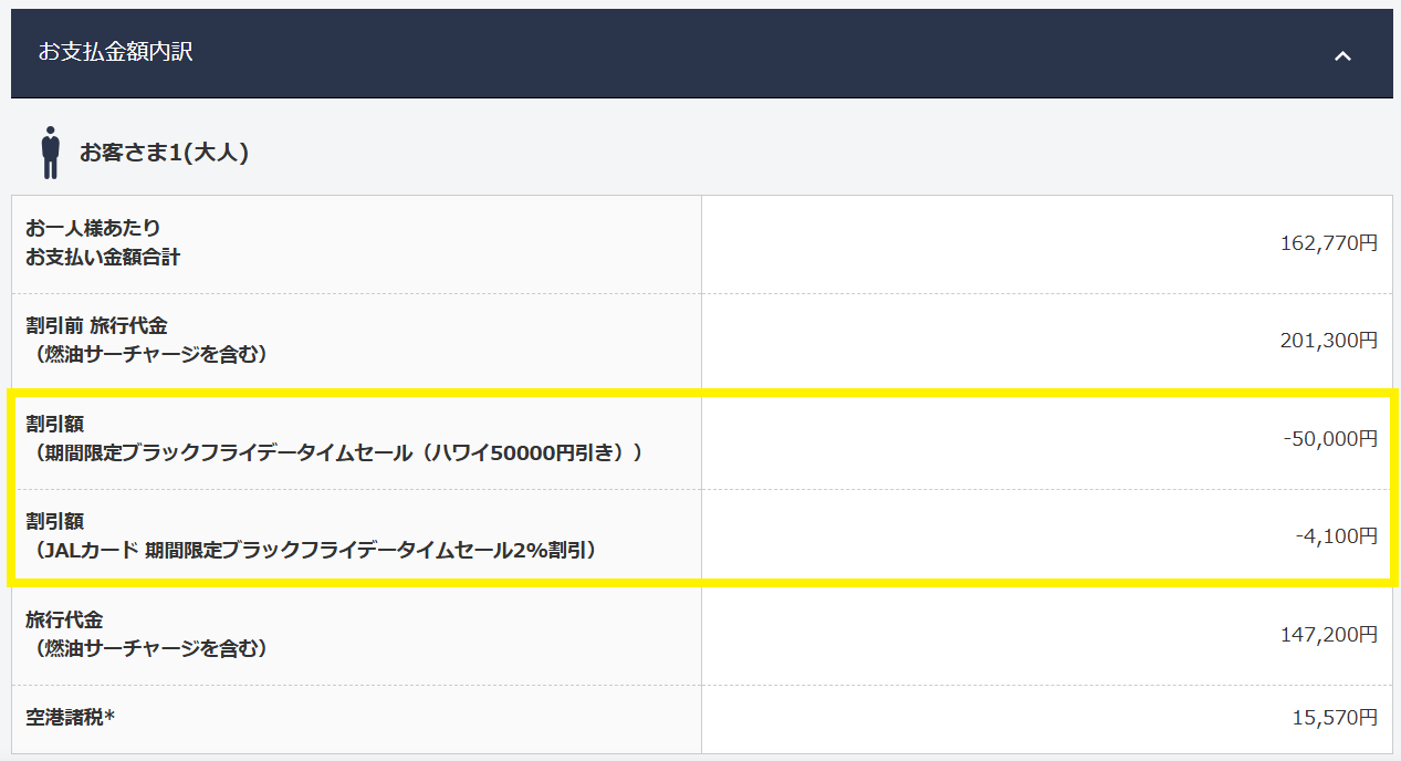 JALカード会員さま(普通カード)が、割引後旅行代金総額200,000円のハワイツアー(成田-ホノルル線利用)にエコノミークラス(個人包括旅行運賃)でお1人様でご参加の場合