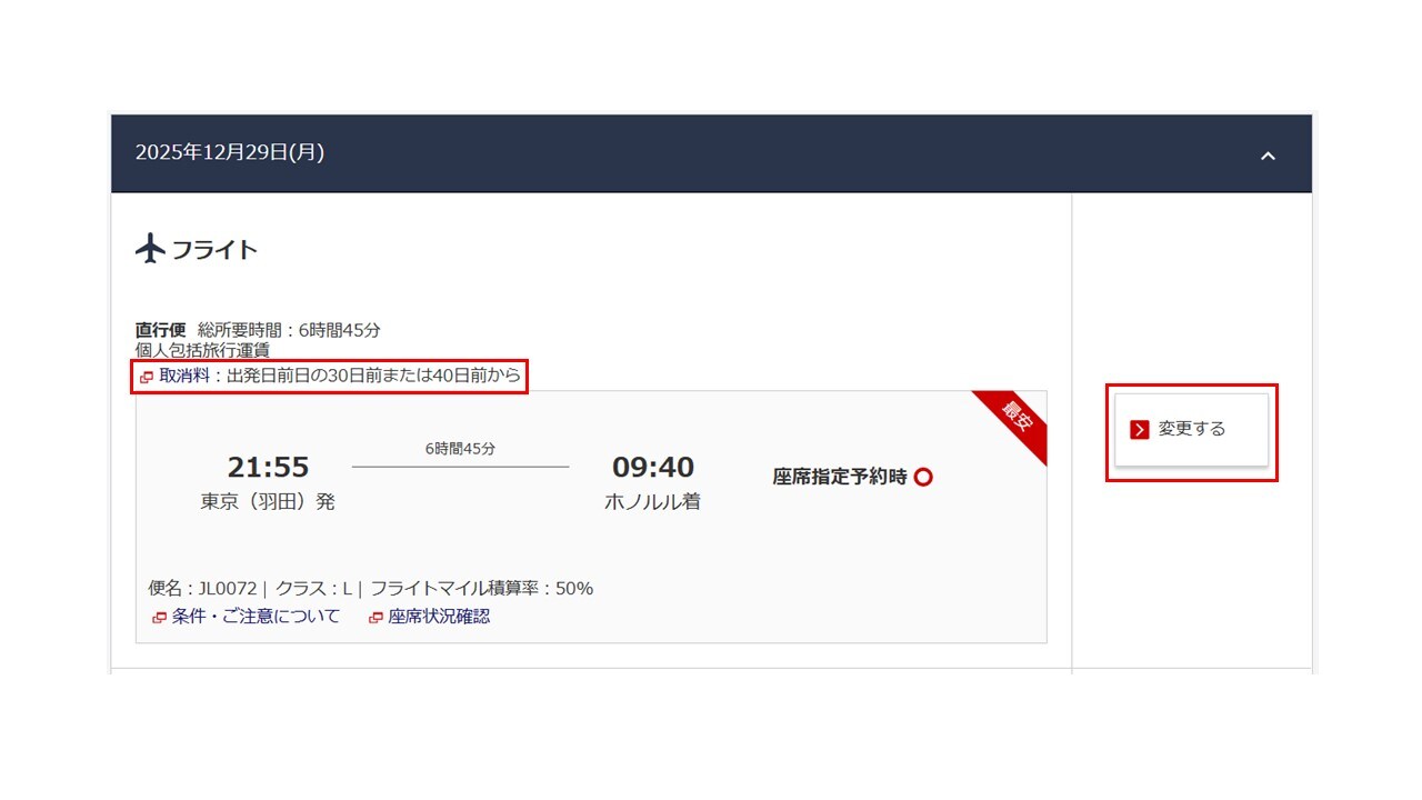 予約時、フライト選択の際に取消料発生時期をご確認いただけます。