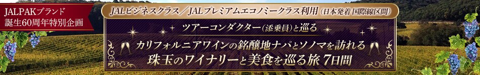 いつもJALグループをご利用いただきありがとうございます。 このたび、JALPAKブランド誕生60周年記念特別ツアーの一つとして、カリフォルニアワインの名産地・ナパとソノマのワインを体験いただく記念ツアーをご用意いたしました。ツアーに先立ちまして、その魅力をお伝えする商品説明会&ワイン試飲会を開催します。