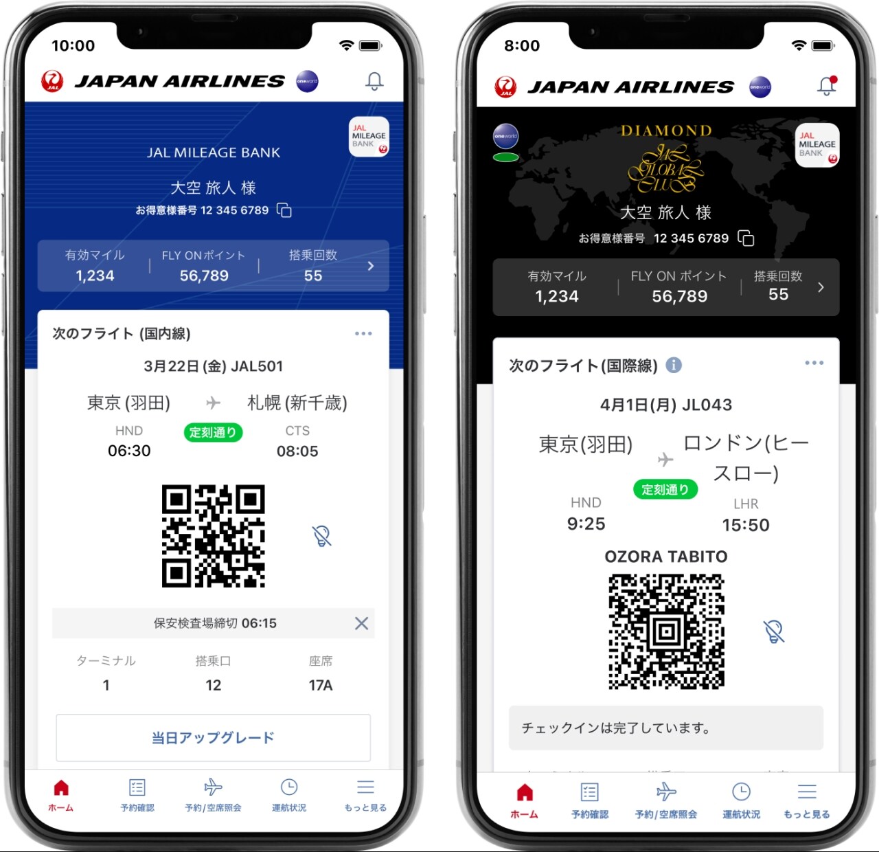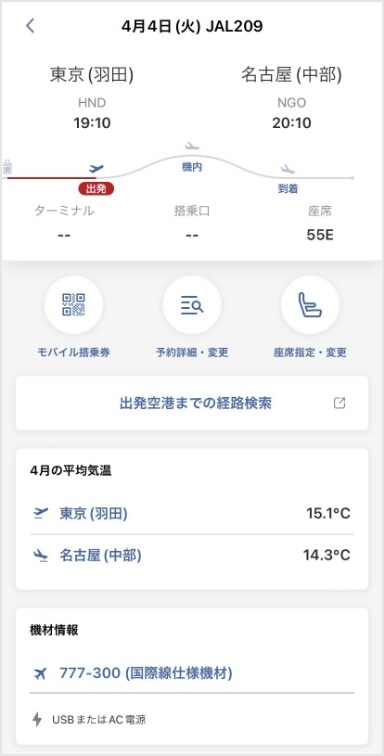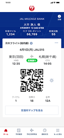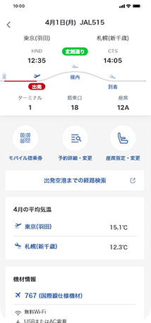 ご搭乗時に必要なモバイル搭乗券をアプリで取得すれば、空港での搭乗券発行のお手続きが不要でスムーズにご搭乗いただけます。モバイル搭乗券では、最新の運航状況や搭乗口などを一目で確認いただけます。