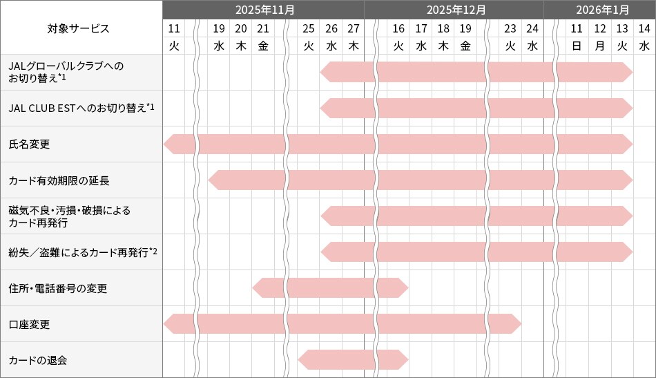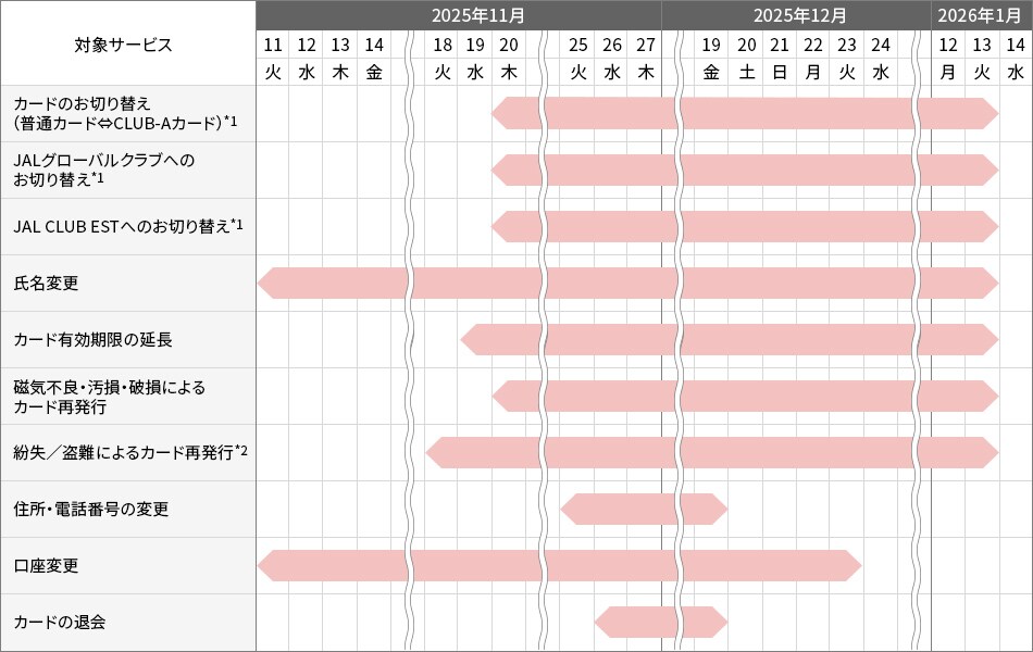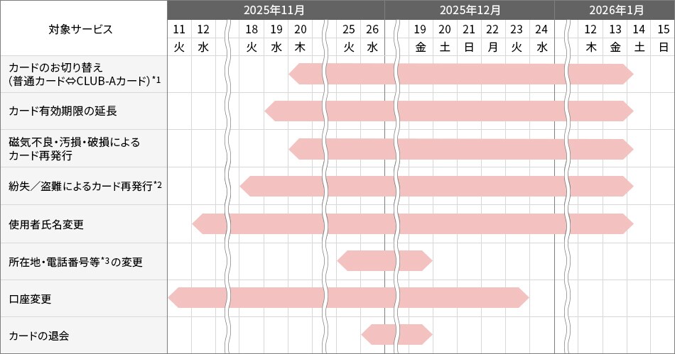システム停止期間中も当社にて受付を継続いたしますが、以下の期間に受付いたしますお手続きに関しましては、受付からカードお届けまで最大6週間いただきます。