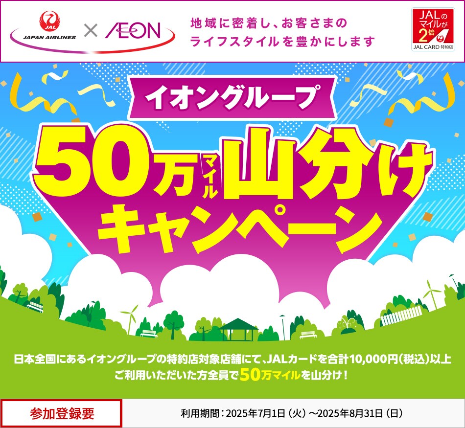 日本全国にあるイオングループの特約店対象店舗にて、JALカードを合計10,000円(税込)以上ご利用いただいた方全員で50万マイルを山分け!