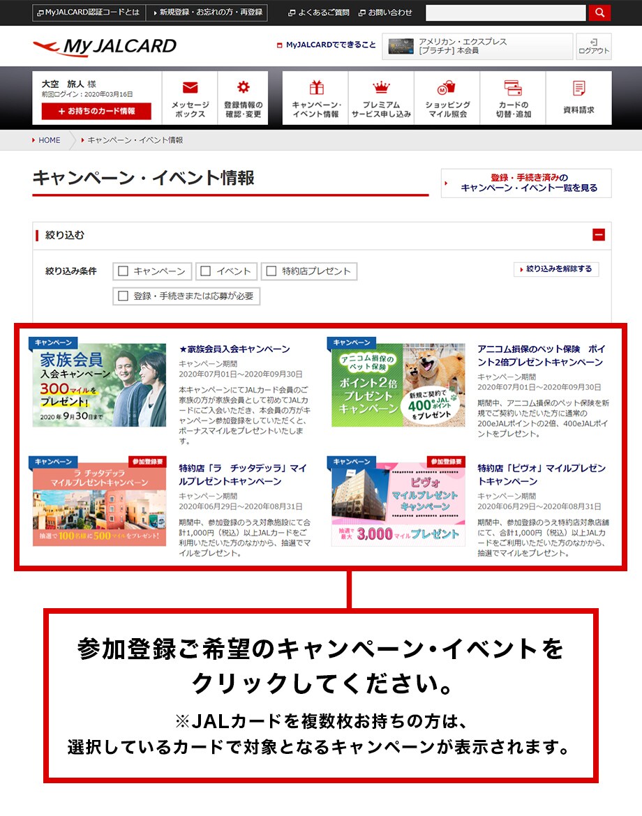 JALカードのキャンペーンは、JALカード会員専用オンラインサービス「MyJALCARD」にログイン後、キャンペーン参加登録が必要となります