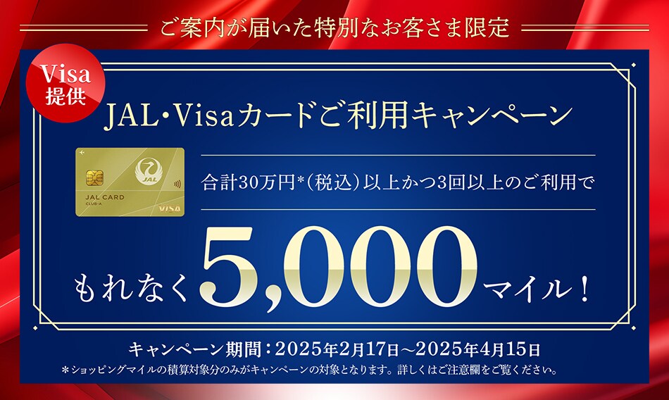 期間中、参加登録のうえJAL・Visaカードを合計30万円*(税込)以上かつ、3回以上利用された方にもれなく5,000マイルをプレゼント。