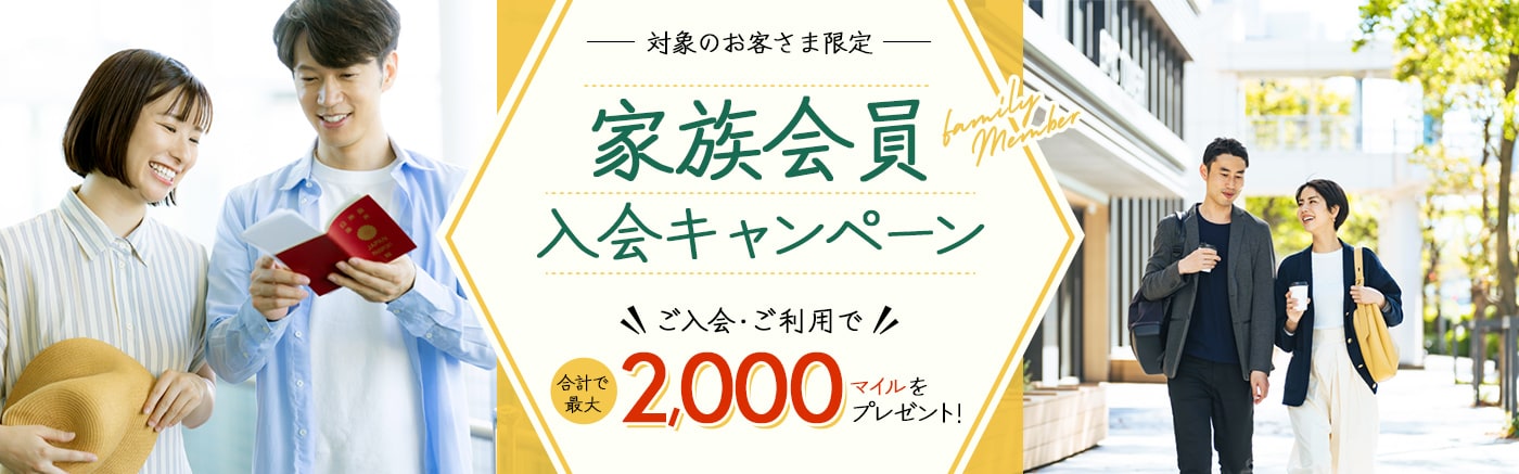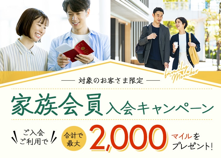 JALカード会員のご家族の方が家族会員として初めてJALカードにご入会のうえ、本会員がキャンペーンに参加登録いただくと、プラチナ・JALダイナースカード・CLUB-Aゴールドカード・CLUB-Aカードの方に合計で2,000マイル(通常キャンペーン1,000マイル+特別マイル1,000マイル)、普通カードの方に合計で1,500マイル(通常キャンペーン1,000マイル+特別マイル500マイル)をプレゼントいたします*1。本ページをご覧になられたお客さま限定のキャンペーンです。